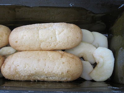 Vamos llenando el molde con capas alternativas de manzana y soletillas. Las pasas, que habremos escurrido previamente, las vamos repartiendo entre las capas. Empezamos por manzana y terminamos siempre con soletillas.