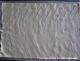 Extendemos la lámina de hojaldre, la podemos dejar sobre el papel que trae para envolverla. La dividimos en tres partes mas o menos iguales, longitudinalmente y marcamos las partes con dos rallas de cuchillo, pero sin cortar. Ahora damos cortes, ( esta vez si cortamos totalmente), paralelos e inclinados, de un par de cm de anchos en sus dos lados, como vemos en la fotografía.