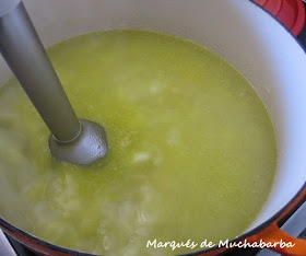 Sacamos el unto y le pasamos la batidora para deshacer la patata y se forme un caldo suave. No es necesario que se deshaga toda la patata. No debe quedar como una crema, sino más bien como una sopa algo espesa. Si es necesario echamos un poco más de agua.