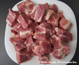 Le quitamos a la carne parte del tocino que tiene por la parte exterior y la cortamos en dados de unos 3 cm de lado.